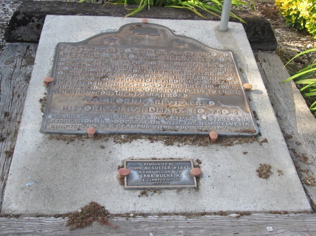 ON JANUARY 12, 1864, PRESIDENT ABRAHAM LINCOLN DECREED THAT WHERE THE CENTRAL PACIFIC RAILROAD CROSSED ARCADE CREEK THE WESTERN BASE OF THE SIERRA NEVADA BEGAN. THE HARDSHIP OF RAILROAD CONSTRUCTION THROUGH MOUNTAINS RESULTED IN INCREASE OF GOVERNMENT SUBSIDIES. THESE FUNDS GAVE THE COMPANY IMPETUS TO FINISH THE TRANSCONTINENTAL RAILROAD.