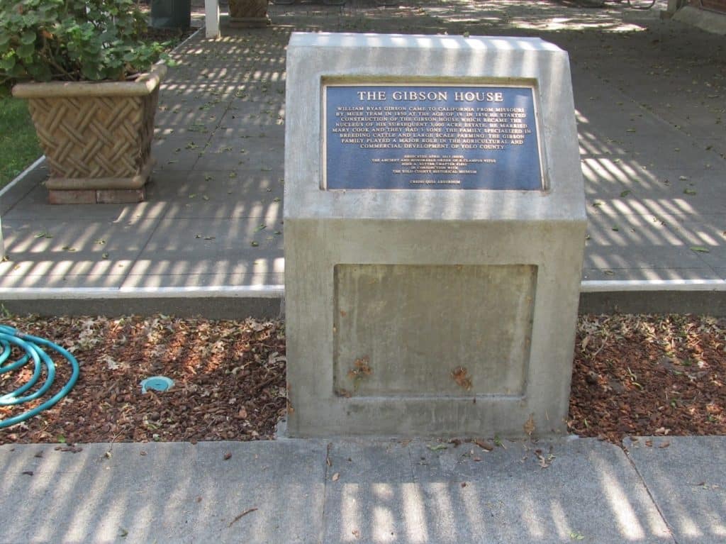 WILLIAM BYAS GIBSON CAME TO CALIFORNIA FROM MISSOURI BY MULE TRAIN IN 1850 AT THE AGE OF 19. IN 1856 HE STARTED CONSTRUCTION OF THE GIBSON HOUSE WHICH BECAME THE NUCLEUS OF HIS SUBSQUENT 3,000 ACRE ESTATE. HE MARRIED MARY COOK AND THEY HAD 3 SONS. THE FAMILY SPECIALIZED IN RAISING CATTLE AND LARGE SCALE FARMING. THE GIBSON FAMILY PLAYED A MAJOR ROLE IN THE AGRICULTURAL AND COMMERCIAL DEVELOPMENT OF YOLO COUNTY.