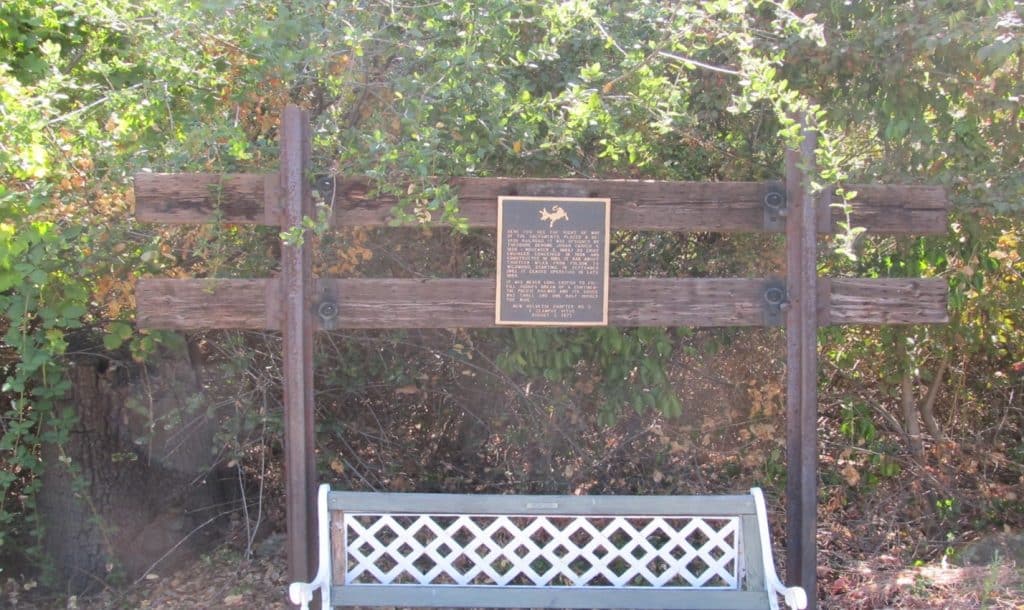 HERE YOU SEE THE RIGHT OF WAY OF THE SACRAMENTO, PLACER AND NEVADA RAILROAD. IT WAS DESIGNED BY THEODORE DEONE JUDAH (MARCH 4, 1826- NOVEMBER 2, 1863) AS CHIEF ENGINEER. CONCEIVED IN 1854 AND CONSTRUCTED IN 1861, IT RAN ABOUT THIRTEEN MILES FROM FOLSOM TO WILDWOOD, STARTING IN SEPTEMBER 1862. IT CEASED OPERATION IN LATE 1864.